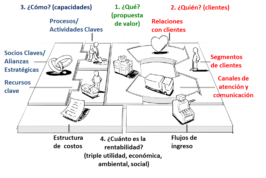 Tal como se puede observar el modelo de negocios, lienzo o canvas como se le llama usualmente, ideado por Alexander Osterwalder y se construye de forma lúdica y utilizando el pensamiento de diseño, metodología de Océano Azul (curvas de valor) y otras herramientas estratégicas innovadoras, lo que permite elaborar el modelo de negocio en poco tiempo logrando con esto minimizar la volatilidad.