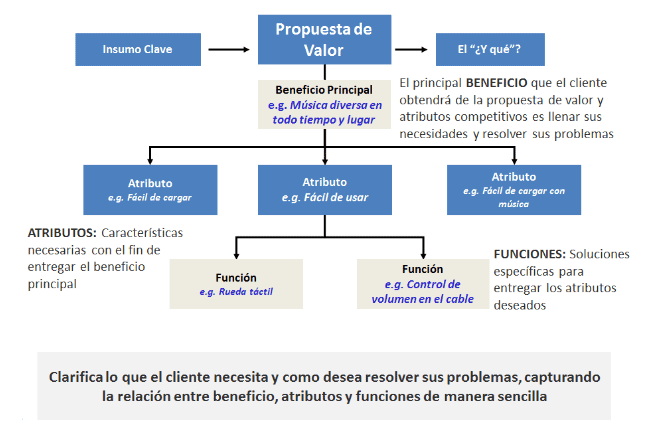 A continuación se puede apreciar los elementos claves de una propuesta de valor, tomando de ejemplo la del ipod de Apple, en la cual se aprecia el beneficio principal, atributos y funciones que permitieron que este invento el disfrutar de la música a nivel mundial.